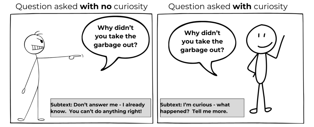 What do you notice here? Do you notice that this entire last group of phrases actually started with a question? It started with the question, “How could you have forgotten the trash?” But do you think that the asker actually expected a response? Do you think that there was true curiosity behind that question? Do you think that this spouse truly wanted to know how their spouse could have forgotten the trash? It’s actually a fairly unanswerable question. I mean, is it being asked in the spirit of curiosity? I think not. Let’s reimagine this conversation now.