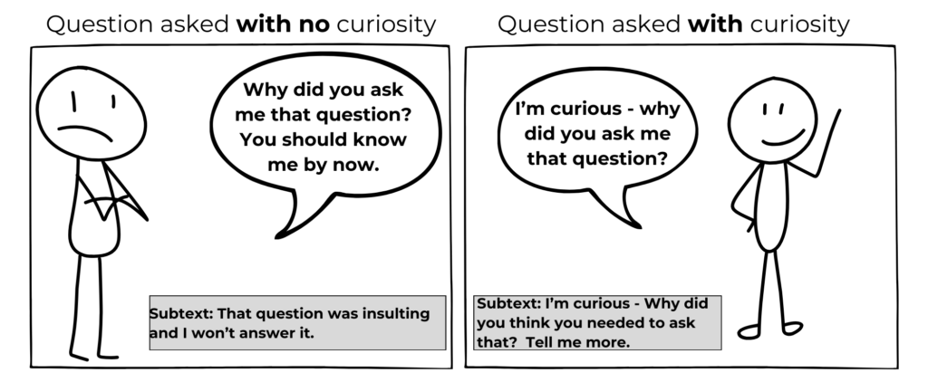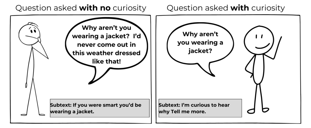 In every situation, I encourage asking questions with a “tell me more” mentality. Imagine after every question you ask, you are adding on a “tell me more.” If that works, then it is probably a question worth asking. If it doesn’t work, consider whether you are truly curious to hear an answer. If so, try rephrasing the question so that a “tell me more” tagged on the end makes more sense.