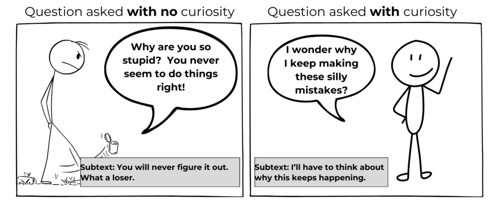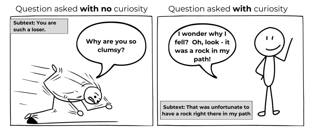 - Notice the questions you are asking throughout your day. Consider whether you are asking questions because you are truly curious or if you are asking questions to condemn, judge or make a point.