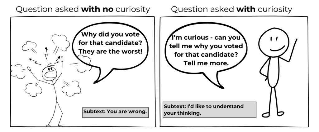 - “Why did you vote for that candidate? They are the worst. Tell me more.” – Questions followed by judgment don’t work with “tell me more.”