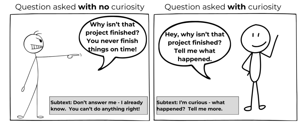 - Start noticing when you are asking rhetorical questions, identified by your not leaving space for or curiosity about an answer. When you find yourself doing this, stop yourself, get curious and flip the script by asking a question and then stopping to hear the answer.