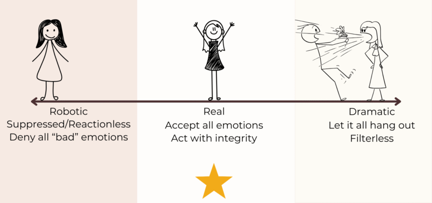 There is a middle ground – being real. This is where you accept and let yourself feel your emotions rather than fearing them or trying to suppress them. This is where you resist the urge to judge yourself for whatever you are feeling and equally resist the urge to let all of your emotions (and any associated unfiltered reactions) hang out.